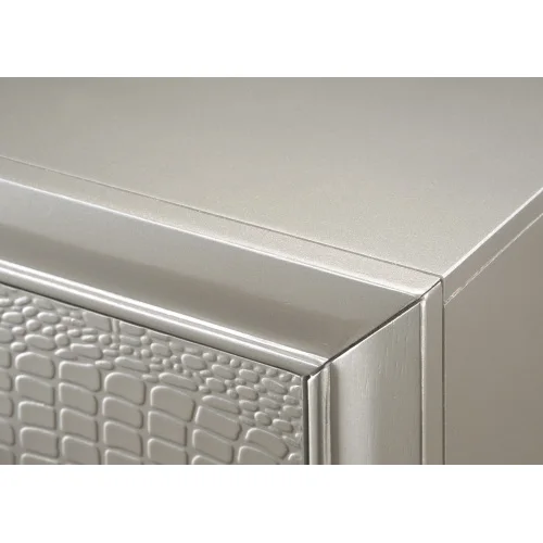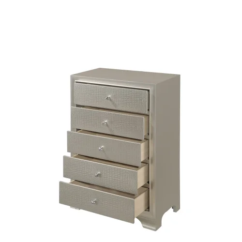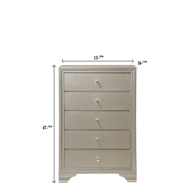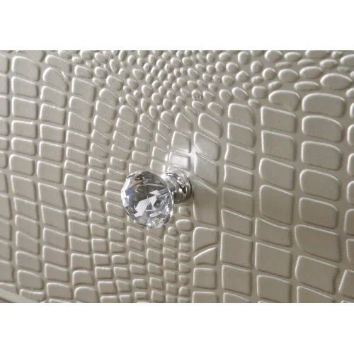 This charming chest features an embossed champagne crocodile finish and decorative knob hardware. Not just nice to look at, the chest has five drawers sturdily constructed with French and English dovetail joinery. The top drawer is lined with felt to help protect delicate items. Pair with the matching bed for a glamorous and stylish set.