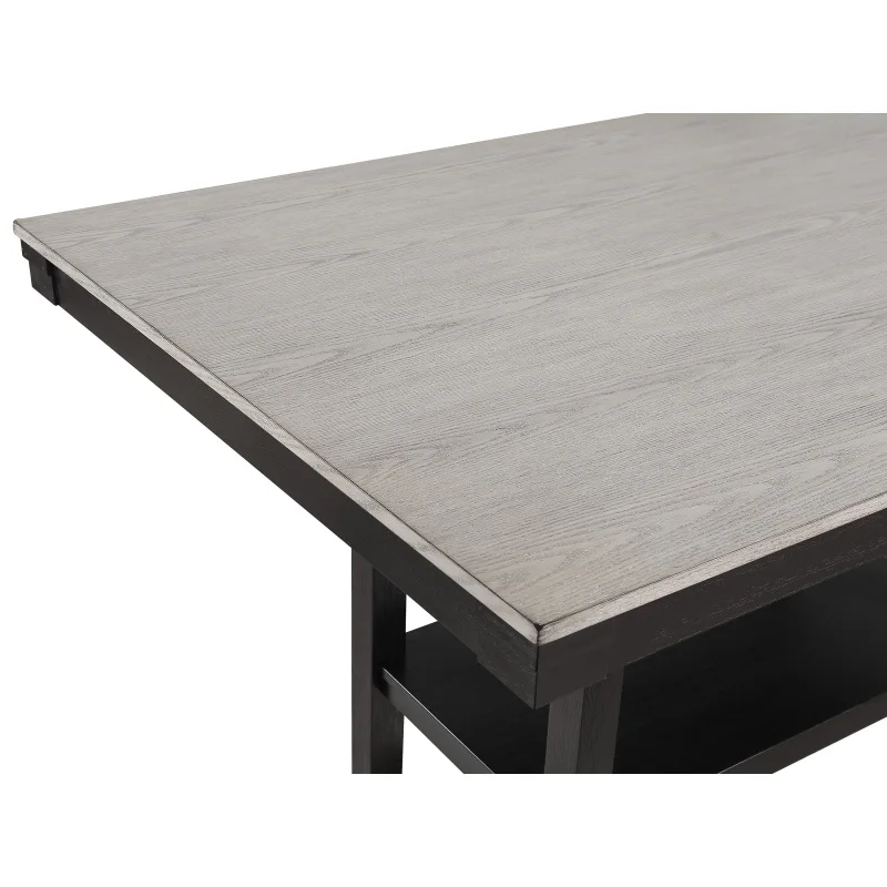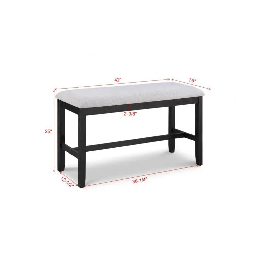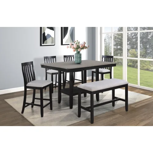 Description:- This counter-height dining group marries modern sophistication with casual dining. The ensemble includes a robust table in a 2 toned finish that brings a bold statement to your dining space. The clean lines and solid construction reflect contemporary design trends, while the high-back chairs and spacious bench boast a complementary gray upholstery, adding a touch of refined comfort. The bench option introduces a versatile seating choice, perfect for family gatherings.