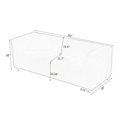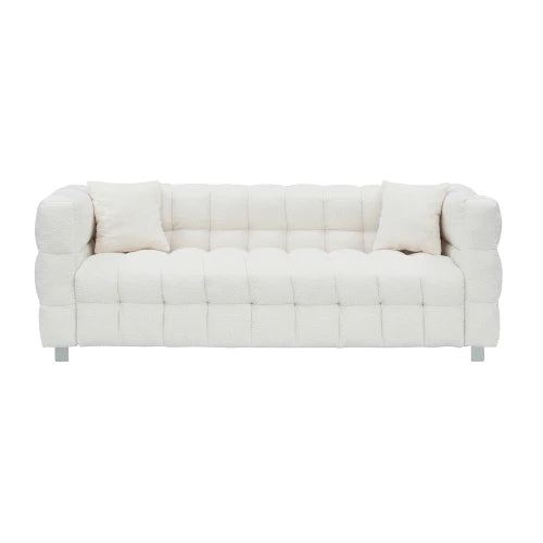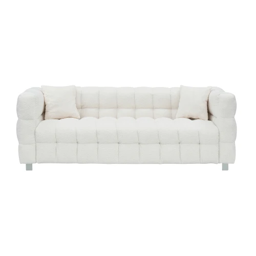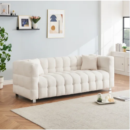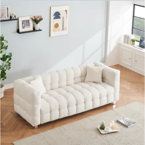 Beige teddy fleece sofa 80 inch discharge in living room bedroom with two throw pillows hardware foot support