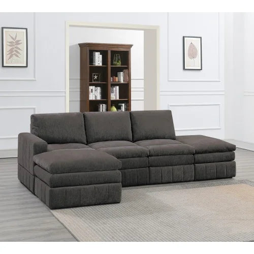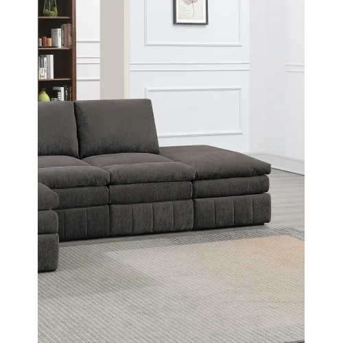 A triple layer cake comes to mind with this extraordinary designed modular sectional set. Each piece is crafted with three tiers topped with plush pillow-top seating and back support to match. Go straight to the moon with this 5-piece set that provide comfort and style that is out of this world. Explore your options with a traditional sectional or try a loveseat, sofa and ottoman combo to suit your style and comfort. This set includes two of each of the following: Right/Left one-arm chair, armless chair, and ottoman. Available in a smooth suede-like fabric in granite and mink.