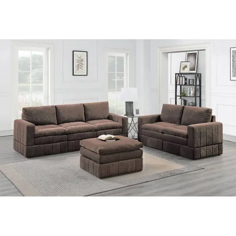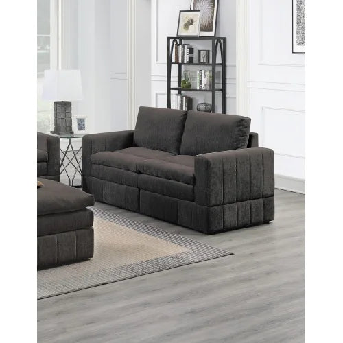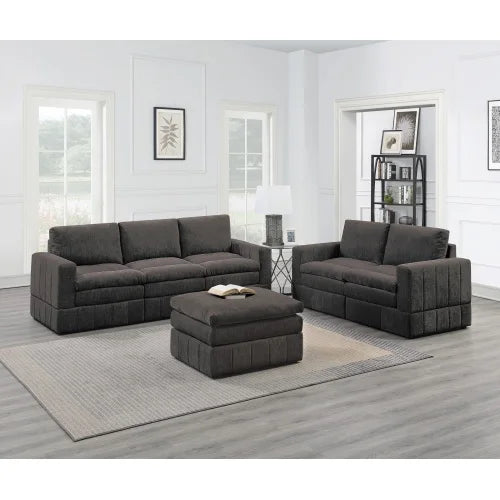 A triple layer cake comes to mind with this extraordinary designed modular sectional set. Each piece is crafted with three tiers topped with plush pillow-top seating and back support to match. Go straight to the moon with this 6-piece set that provide comfort and style that is out of this world. Explore your options with a traditional sectional or try a loveseat, sofa and ottoman combo to suit your style and comfort. This set includes two of each of the following: Right/Left one-arm chair, armless chair, and ottoman. Available in a smooth suede-like fabric in granite and mink.