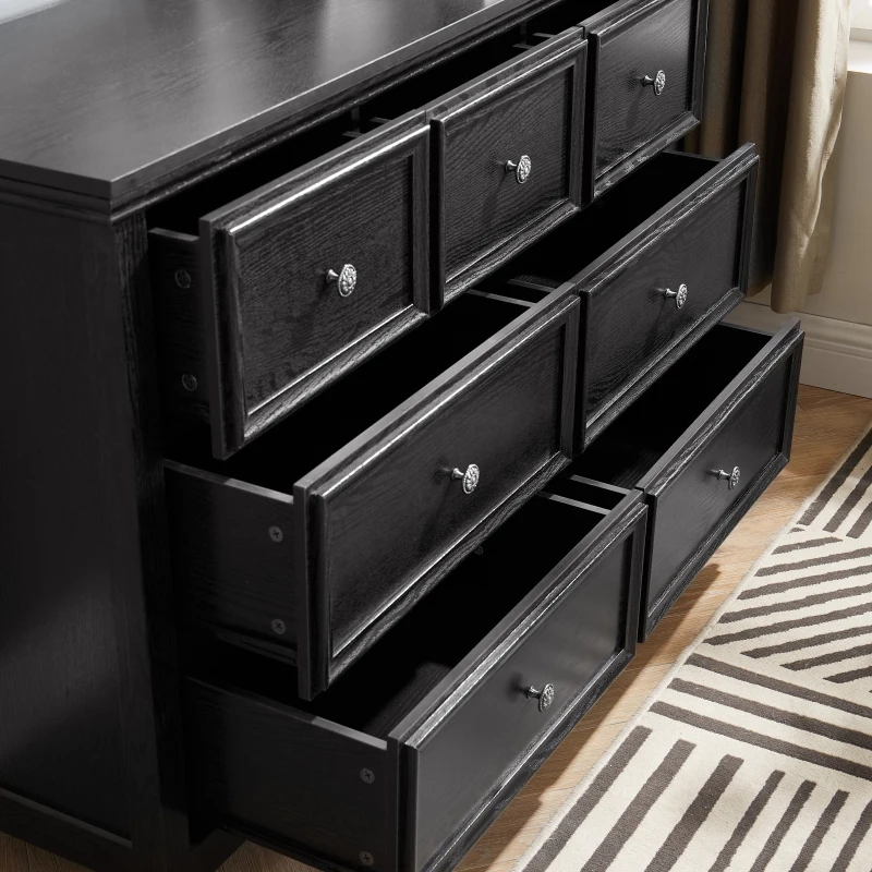 The Cabinet with 7 large drawers and top 3 drawers are all equipped with wide slides easy to store your t-shirt, socks, or trousers and so on. Freeing up more space !