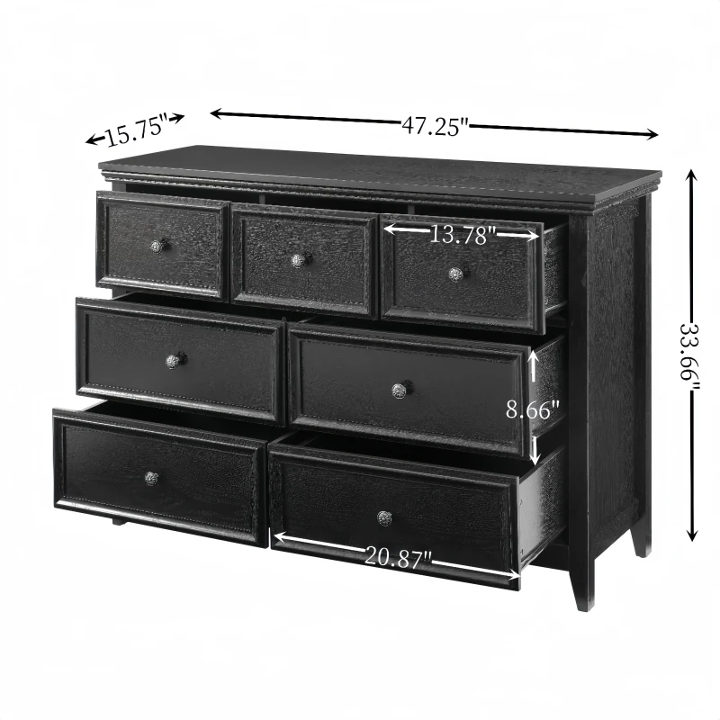 Assembled dimension: 47.25"W x 15.75"D x 33.66"H.This wood dresser is designed with a spacious interior. The drawers won't collide or collapse. And the chest provides an appropriate height to place the potted plant or a printer or TV.