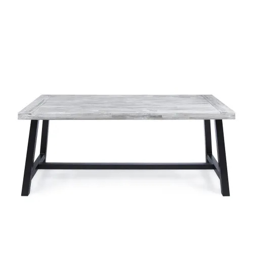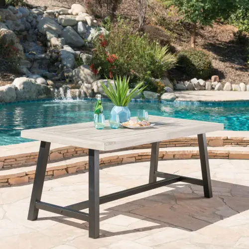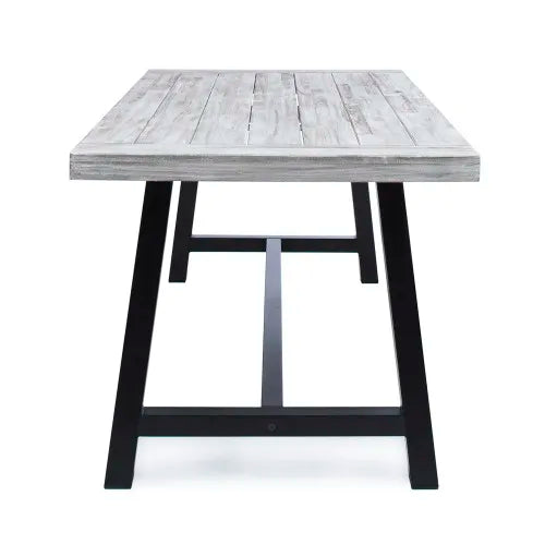Made from sustainable acacia wood and rugged iron, this rustic outdoor dining table is the perfect addition to your backyard, patio, or garden.